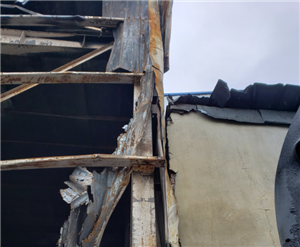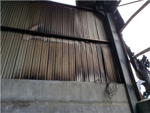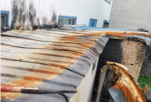 起火單位是陜西某汽車零配件銷售公司,主要經(jīng)營汽車配件,起火建筑為單層鋼結(jié)構(gòu)建筑,建筑面積2000平方米,南北長60米,東西長35米,從中間分隔后分為兩個庫房,其中靠東邊的庫房租賃給湖北十堰某汽車配件公司做庫房,剩余部分自己使用,東北側(cè)為某鈦板加工廠,東南側(cè)為某鈦棒打磨廠,西側(cè)為某鍛熱機械公司(見圖1)。其中陜西某汽車零配件公司和湖北十堰某汽車配件公司兩個庫房全部過火(見圖2)。鈦板加工廠,單層鋼結(jié)構(gòu),建筑面積1400平方米,主要經(jīng)營鈦板的切割,廠房西南角局部過火(見圖3)。某鈦棒打磨廠,單層鋼結(jié)構(gòu)建筑,建筑面積1000平方米,主要經(jīng)營鈦棒打磨,其單位西側(cè)與湖北十堰某汽車配件庫房緊挨的危廢庫房彩鋼板頂部過火(見圖4)。這4家企業(yè)之間僅使用單層鐵皮分隔。位于汽車配件庫房西側(cè)的某鍛熱機械設(shè)備有限公司,單層彩鋼板建筑,面積2800平方米,廠房東側(cè)彩鋼板局部過火。