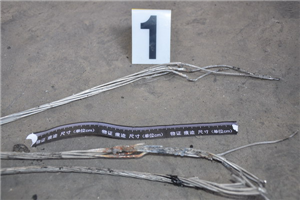 轄區(qū)消防救援機構(gòu)在起火點下方1.8米處(鈦板加工廠南側(cè)墻壁上)提取到電氣線路融痕(見圖9)。送至天津消防研究所鑒定,經(jīng)鑒定為短路熔痕。
