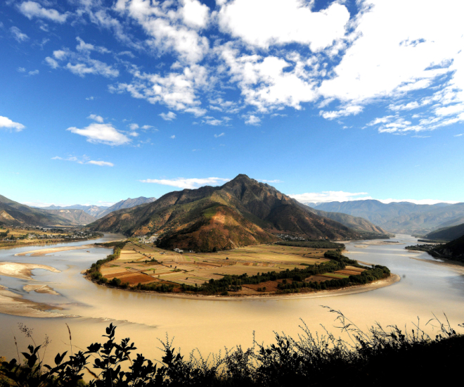 長(zhǎng)江第一灣位于云南省西北部的麗江市石鼓鎮(zhèn)與香格里拉縣南部沙松碧村之間,海拔1850米,距香格里拉縣城130公里,有公路直達(dá)。萬(wàn)里長(zhǎng)江從“世界屋脊”——青藏高原奔騰而下,巴塘縣城境內(nèi)進(jìn)入云南,與瀾滄江、怒江一起在橫斷山脈的高山深谷中穿行形成了“三江并流”的壯麗景觀。到了香格里拉縣的沙松碧村,突然來(lái)了個(gè)100多度的急轉(zhuǎn)彎,轉(zhuǎn)向東北,形成了罕見的"V"字形大彎,“江流到此成逆轉(zhuǎn),奔入中原壯大觀”,人們稱這天下奇觀為“長(zhǎng)江第一灣”。