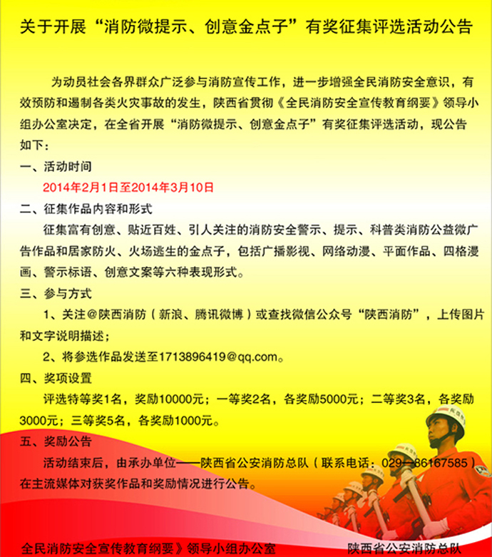 為動(dòng)員社會(huì)各界群眾廣泛參與消防宣傳工作,進(jìn)一步增強(qiáng)全民消防安全意識(shí),有效預(yù)防和遏制各類火災(zāi)事故的發(fā)生,由陜西省貫徹《全民消防安全宣傳教育綱要》領(lǐng)導(dǎo)小組辦公室主辦,陜西省公安消防總隊(duì)承辦,從2014年2月1日至2014年3月10日,在全省開(kāi)展“消防微提示、創(chuàng)意金點(diǎn)子”有獎(jiǎng)?wù)骷u(píng)選活動(dòng)。