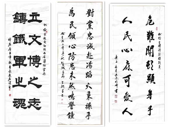 省消防協(xié)會(huì)會(huì)長(zhǎng)賈西海、秘書(shū)長(zhǎng)卞建峰與書(shū)法家們進(jìn)行了親切的會(huì)談,賈西海會(huì)長(zhǎng)介紹了協(xié)會(huì)在消防科普宣傳方面的主要工作和成績(jī)。創(chuàng)作期間,王剛副主席親自編撰并提筆寫(xiě)下“對(duì)黨忠誠(chéng)赴湯蹈火秉操守,為民傾心防范未然鳴警鐘”這副對(duì)聯(lián),字體行云流水、矯若驚龍,贏得在場(chǎng)人員連連稱贊;曾祥斌院長(zhǎng),凝神構(gòu)思、筆走龍蛇在紙上寫(xiě)下“烈火英豪”四個(gè)大字,字體氣勢(shì)磅礴、筆酣墨飽。石溪院長(zhǎng)13歲的孫女專程前來(lái)書(shū)寫(xiě)了“消防安全教育要從孩子抓起”,各位書(shū)法家們即興創(chuàng)作、揮毫潑墨、各顯神通,一幅幅佳作漸浮紙面,現(xiàn)場(chǎng)頓時(shí)被濃濃的文化氣息包圍,不時(shí)響起陣陣掌聲。“烈火真金見(jiàn),唯我火焰藍(lán)”、“牢記職責(zé)使命,傳承優(yōu)良作風(fēng)”、“不忘初心”、“危難關(guān)頭顯身手,人民心底可愛(ài)人”等作品一氣呵成,猶如騰龍走蛇,氣象萬(wàn)千。