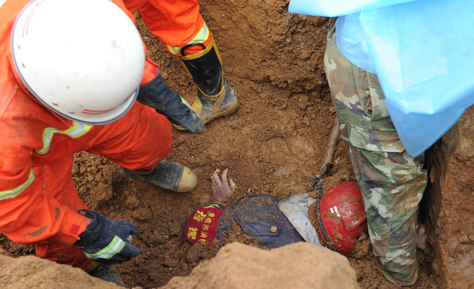 2014年5月26日,湖北安陸一工地發(fā)生塌方,3名消防員救人犧牲,中隊(duì)長盧亮至死都保持著救人的姿勢。圖片來自網(wǎng)絡(luò)