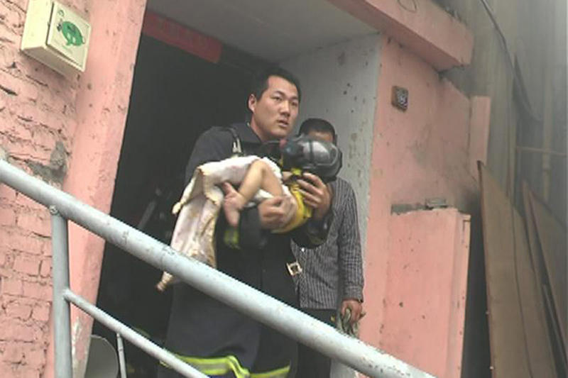 2014年3月30日下午16時(shí)43分許,江蘇省徐州一居民樓著火,消防官兵及時(shí)將空氣呼吸器面罩拿了下來并放到嬰兒的口鼻處,為嬰兒送上新鮮的空氣。圖片來自網(wǎng)絡(luò)