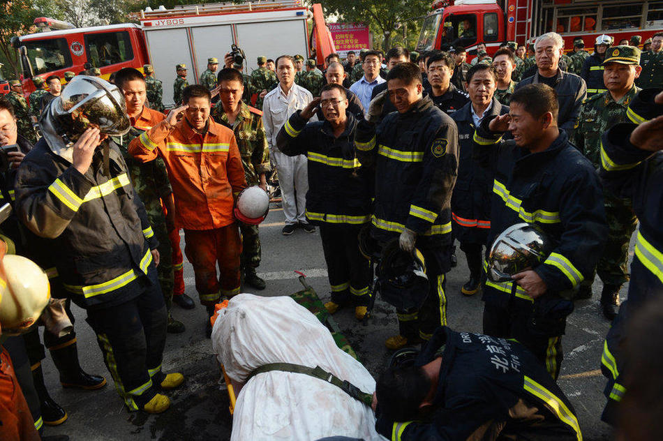 2013年10月11日,北京,消防隊(duì)員向犧牲的隊(duì)友遺體敬禮告別。當(dāng)日,北京市石景山喜隆多商場發(fā)生火災(zāi),兩名山東籍消防戰(zhàn)士劉洪坤和劉洪魁在撲救過程中不幸犧牲。圖片來自網(wǎng)絡(luò)