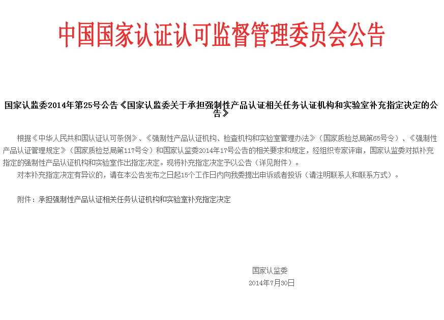 國(guó)家認(rèn)監(jiān)委2014年第25號(hào)公告《國(guó)家認(rèn)監(jiān)委關(guān)于承擔(dān)強(qiáng)制性產(chǎn)品認(rèn)證相關(guān)任務(wù)認(rèn)證機(jī)構(gòu)和實(shí)驗(yàn)室補(bǔ)充指定決定的公告》(轉(zhuǎn)發(fā))